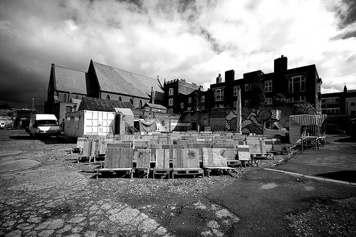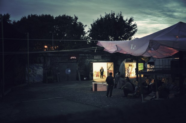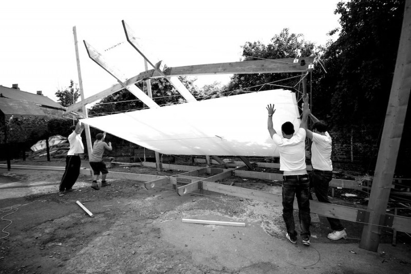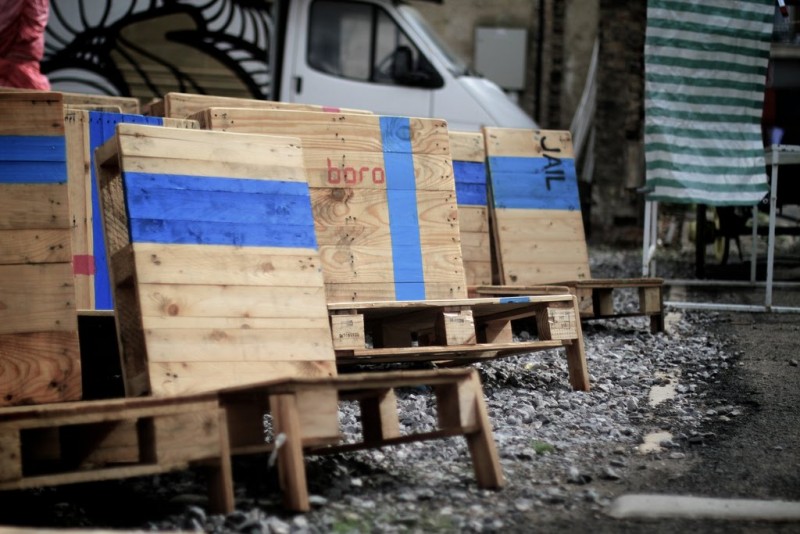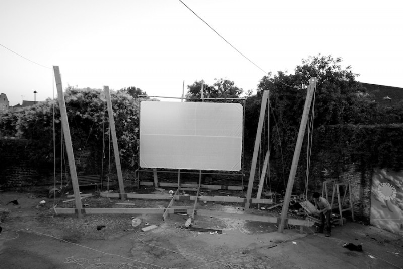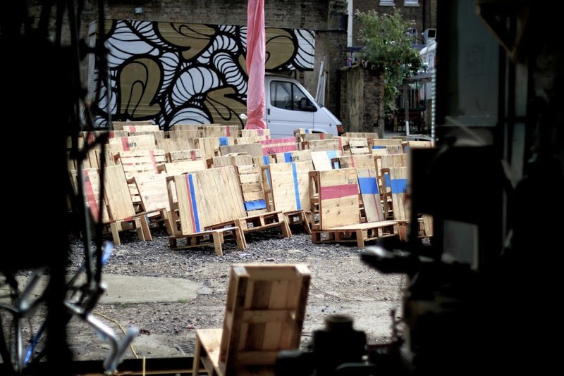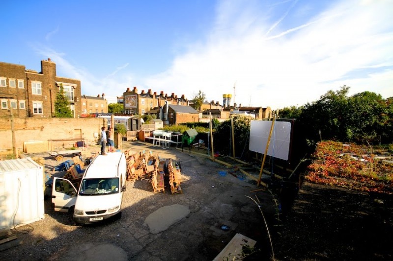 DEPTFORD CINEMA Deptford Cinema was a 200-seat temporary outdoor cinema with summer screenings programmed by Silent Cinema. The existing natural corner of the site adjacent to the railway arches provided an anchor for the 10 metre screen and seating, the latter of which were made from 500 repurposed end-of-life wooden paletts. The screen structure was designed to be a free standing object, allowing the potential to hoist up tarpaulins for rain cover and shade. Image courtesy of The Deptford Project