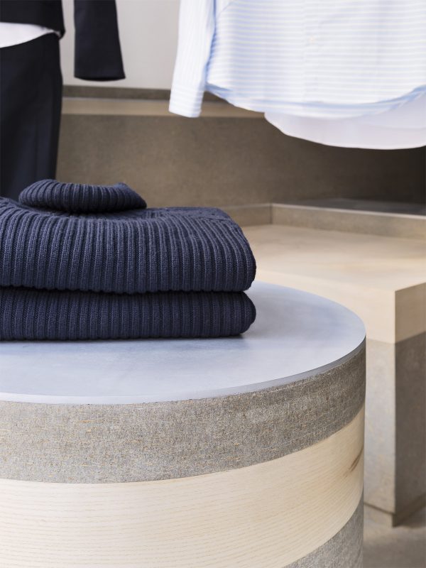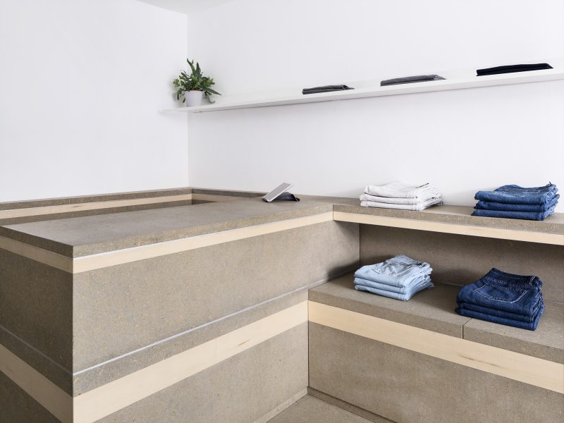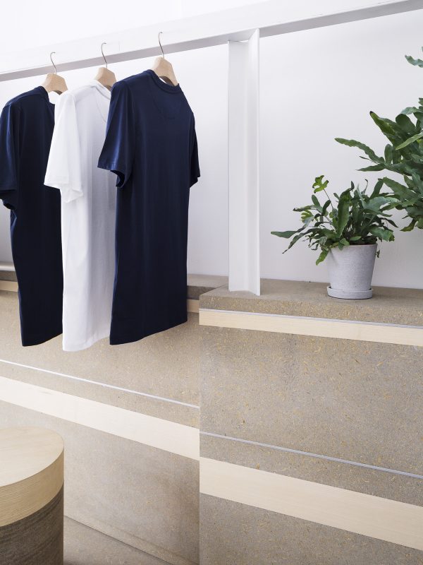 Hand crafted from viroc, a composite board made of dry mixture pine wood chipping and cement. Covering the floors, surrounding walls, as well as the cash desk and display stools. Inspiration for the design came from cylindrical sections of drilled rock, known as core samples.