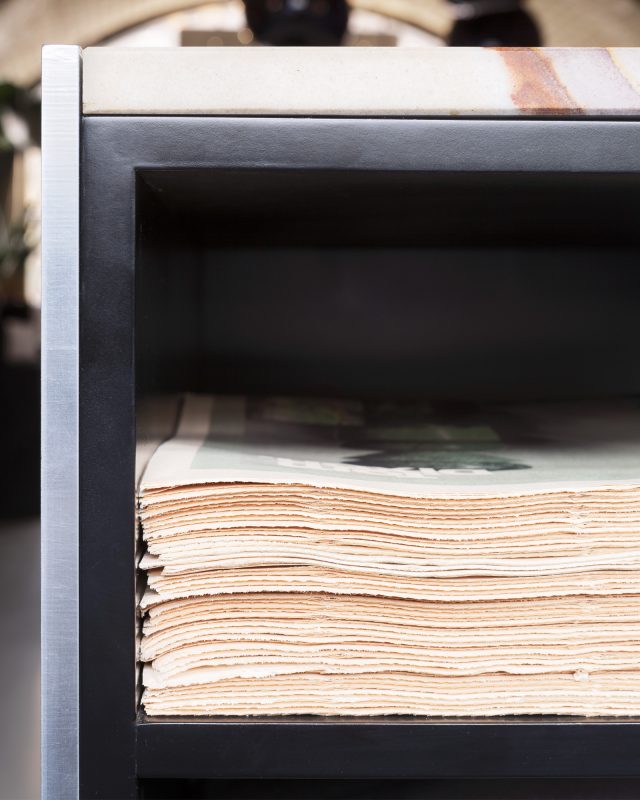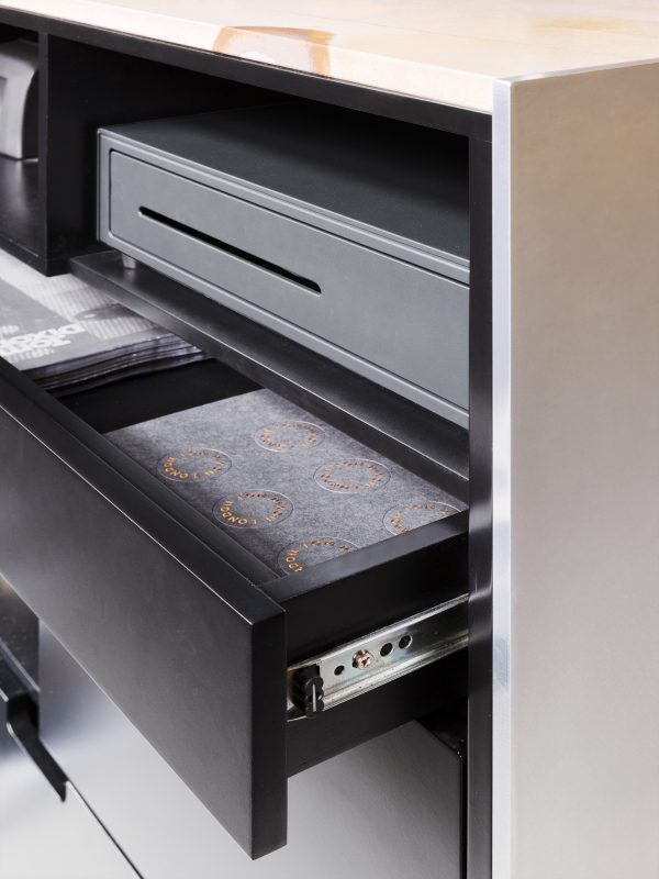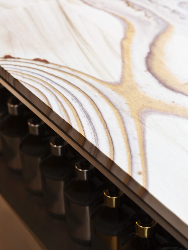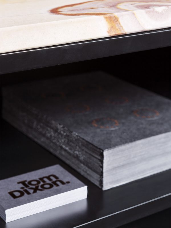 TOM DIXON PERFUMERY DESK Constructed from CNC machined 10mm thick aluminium. Making up the front top and sides of the desk. The aluminium was finished in a radial grit surface, creating light circular formations all over. The top surface is a staggering piece of solid natural marble, supplied from the clients own collection. The adjacent side of the desk was made from high quality FSC wood and spray finished in matt black. The contrasting silver brushed finish of the aluminium and smooth black finish cabinetry perfectly compliments each other. Photos by Ollie Hammick.